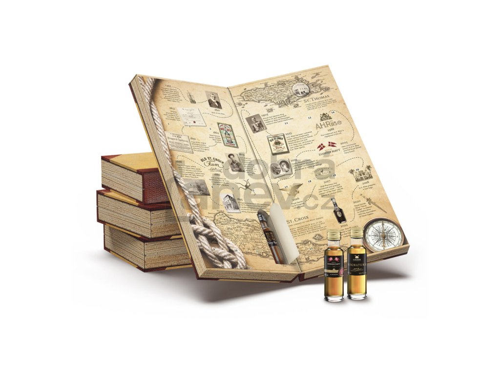A. H. Riise vypustil ven vlastní rumový kalendář: Rumový kalendář A. H. Riise 2022 24 x 20ml – ten je dekorován retro obrázky lékárny pana A. H. Riise ve městě St. Thomas na Panenských ostrovech.Tento rumový kalendář má hezké balení, je to jako velká kniha, která má 24 papírových perforovaných okýnek. V nich najdete 24 rumů, z toho 18 od A. H. Riise.