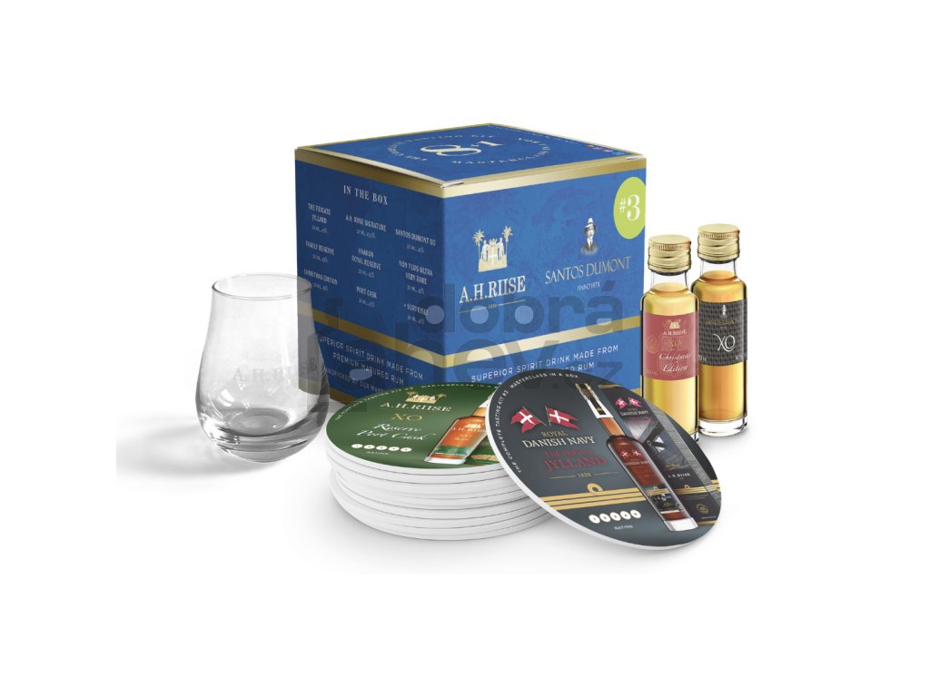 Připravili jsme pro vás tři lahodné degustační boxy, které vám dokonale představí svět A.H. Riise. Tři krabičky obsahují skleničku A.H. Riise, podtácky s degustačními poznámkami pro každou z osmi mini lahviček (2 cl) s různými směsmi z řady A.H. Riise XO, Danish Navy, řady Ultra Premium a směsí od Santos Dumont. Devátá láhev je speciálním překvapením! Tři krabičky byly pojmenovány "Albert", "Henriette" a "Valdemar" podle samotného Alberta Heinricha Riiseho, jeho manželky a jednoho z jejich synů. Pomocí degustačních boxů můžete najít svého osobního favorita ještě před zakoupením celé láhve - nebo uspořádat vlastní Masterclass pro přátele a rodinu. Degustační sada obsahuje odkazy na videa s naším ambasadorem značky, rumovým expertem Larsem Code, který komentuje každou směs a sdílí fantastické příběhy, které se za nimi skrývají. Klikněte na tlačítko Přehrát na videu níže a podívejte se na úvod.