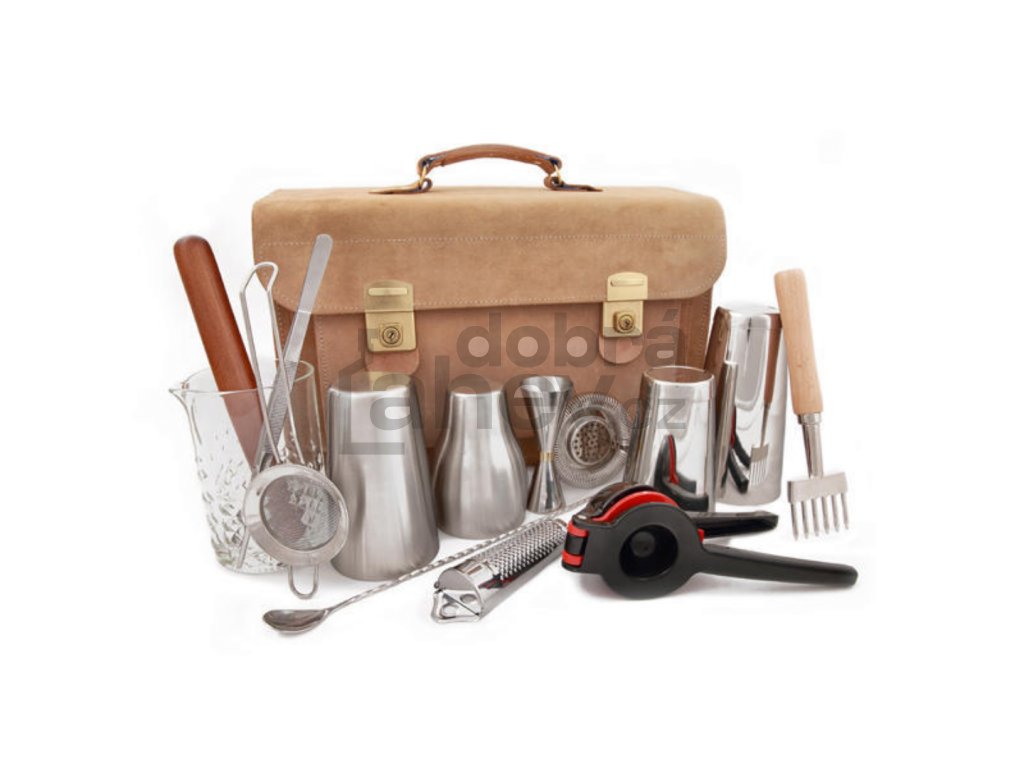 Set barového vybavení v kožené brašně: MEZCLAR šejkr nerez 750 ml MEZCLAR šejkr nerez 500 ml MEZCLAR French šejkr 650 ml MEZCLAR Preciso Jigger 25/50 ml MEZCLAR Round Strainer nerez Míchací lžička SILVER 45 cm Sítko Double strain Struhadlo na muškátový oříšek Muddler dřevěný 25 cm Timeless mixing glass 725 ml Lis na citrusy LIME/CITRUS Pinzeta nerez 25 cm Sekáček na led hráběDoplňkové parametry