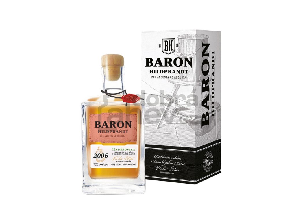 Prvotřídní ovocná pálenka Baron Hildprandt Hruškovice 50 % je vyrobena z výběrových hrušek z jižních Čech. Ruční rodinná malovýroba je zárukou výjimečnosti a díky trojnásobné destilaci jsou odstraněny všechny nežádoucí látky způsobující nevítané chutě či vůně. Opakovaná destilace naopak zintenzivňuje a zušlechťuje hruškovitou chuť pálenky a díky trojímu provedení si stále uchovává 50 % obsahu alkoholu. Ultra jemný a čistý destilát, který zraje 1 rok ve smaltovaných tancích, tak bude pokaždé unikátním zážitkem s žádoucím silným efektem. Vychutnejte si ultra jemnou a čistou hruškovici, na které pracují ti nejlepší odborníci ze zámecké palírny Blatná.