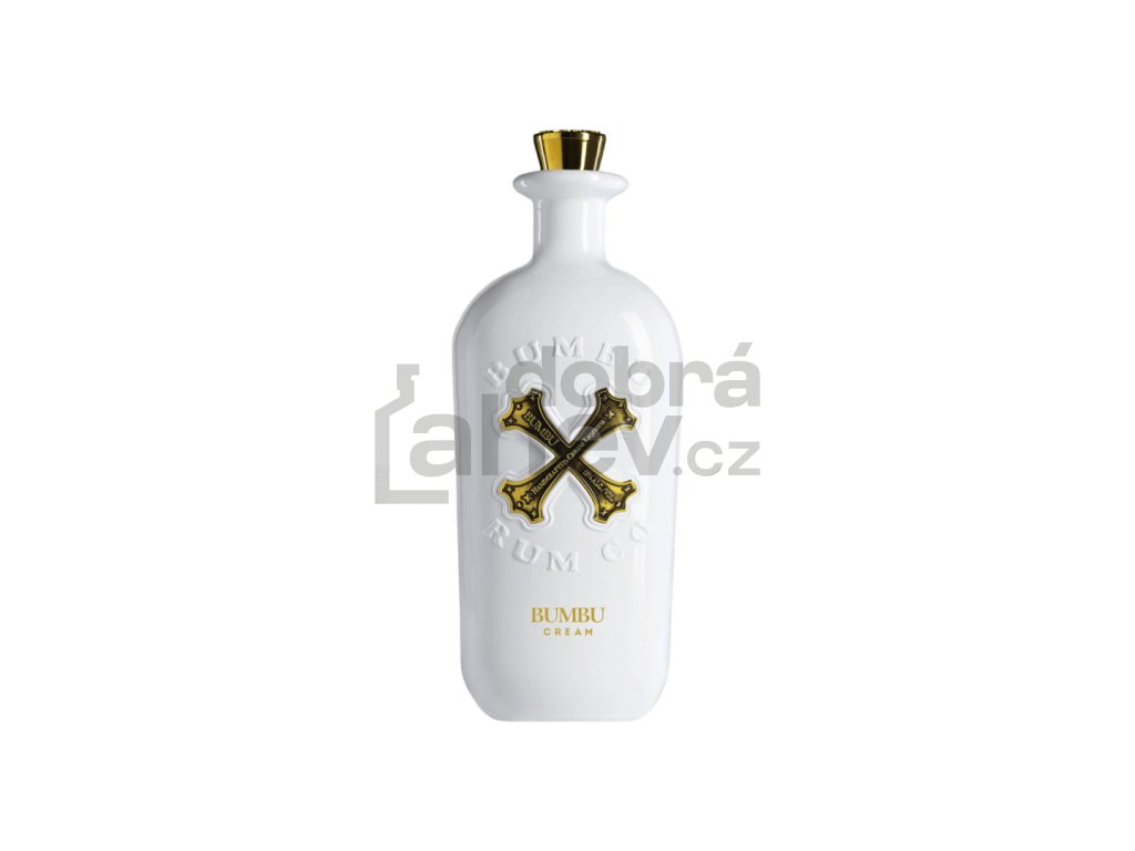 Láhev Bumbu Cream je nádherně malovaná bílá se zlatými a černými uměleckými prvky se zlatě zbarvenou zátkou s vyraženým znakem Bumbu „X".