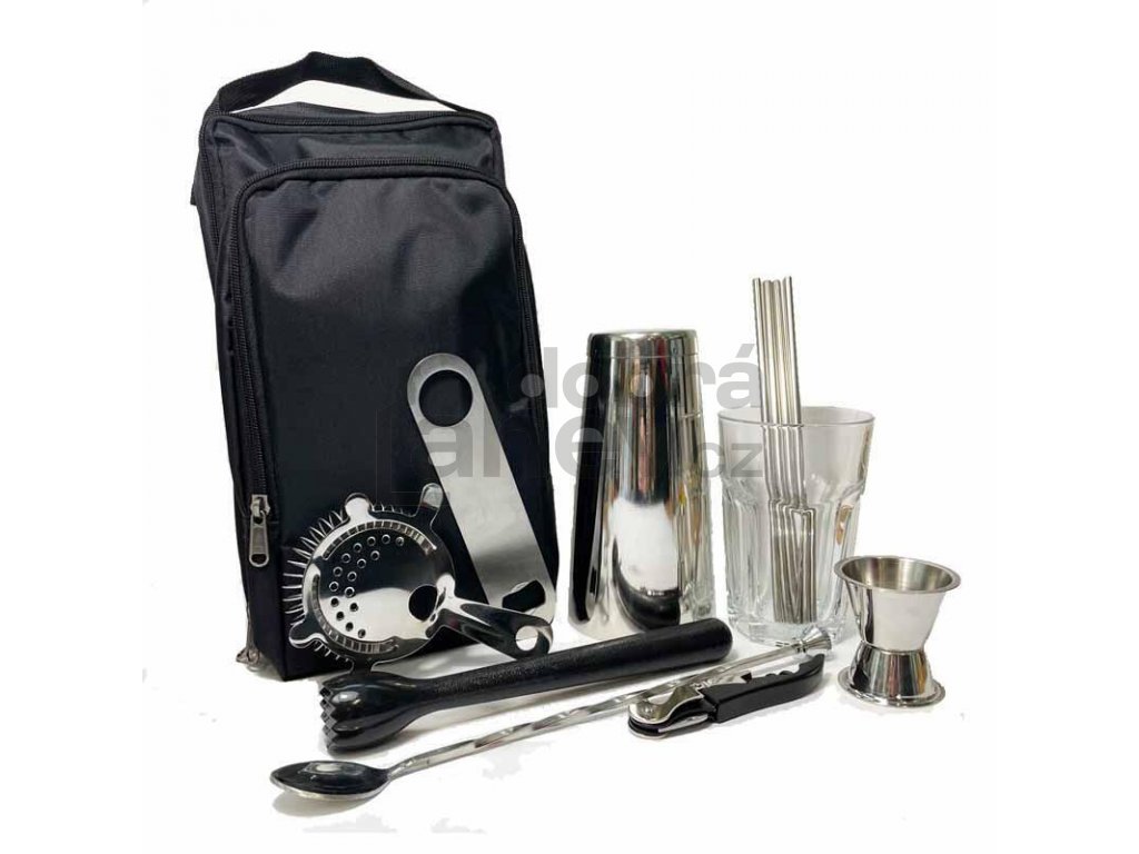 Hobby bar batoh je cenově zvýhodněný set barového vybavení zabalený v praktické nylonové tašce s dvěmi kapsami se zipy. Barový set obsahuje šejkr 750 ml, míchací sklenici, jigger s ryskami, otvírák na víno, míchací lžičku s muddlerem, strainer, muddler, speed otvírák a 4 ks nerezových brček. Díky omyvatelné nylonové tašce máte své barové vybavení na jednom místě a vždy připraveno k použití.